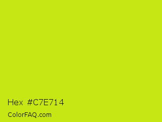 Hex #c7e714 Color is a normal yellow color and the nearest color is Las Palmas #c6e610. Hex code #c7e714 and RGB value is rgb(199,231,20). In RGB color space, this color is composed of 78% red, 91% green, 8% blue, In CMYK color space, this color is composed of 14% cyan, 0% magenta, 91% yellow , 9% black , In HSL color space, this color has a hue angle of 69° , 84% saturation and 49% lightness.