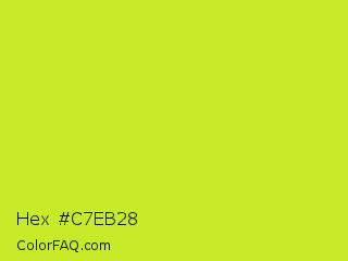Hex #c7eb28 Color is a normal lime color and the nearest color is Pear #d1e231. Hex code #c7eb28 and RGB value is rgb(199,235,40). In RGB color space, this color is composed of 78% red, 92% green, 16% blue, In CMYK color space, this color is composed of 15% cyan, 0% magenta, 83% yellow , 8% black , In HSL color space, this color has a hue angle of 71° , 83% saturation and 54% lightness.
