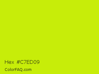 Hex #c7ed09 Color is a normal yellow color and the nearest color is Las Palmas #c6e610. Hex code #c7ed09 and RGB value is rgb(199,237,9). In RGB color space, this color is composed of 78% red, 93% green, 4% blue, In CMYK color space, this color is composed of 16% cyan, 0% magenta, 96% yellow , 7% black , In HSL color space, this color has a hue angle of 70° , 93% saturation and 48% lightness.