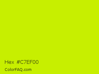 Hex #c7ef00 Color is a normal yellow color and the nearest color is Electric Lime #ccff00. Hex code #c7ef00 and RGB value is rgb(199,239,0). In RGB color space, this color is composed of 78% red, 94% green, 0% blue, In CMYK color space, this color is composed of 17% cyan, 0% magenta, 100% yellow , 6% black , In HSL color space, this color has a hue angle of 70° , 100% saturation and 47% lightness.
