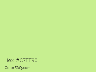 Hex #c7ef90 Color is a light green color and the nearest color is Sulu #c1f07c. Hex code #c7ef90 and RGB value is rgb(199,239,144). In RGB color space, this color is composed of 78% red, 94% green, 56% blue, In CMYK color space, this color is composed of 17% cyan, 0% magenta, 40% yellow , 6% black , In HSL color space, this color has a hue angle of 85° , 75% saturation and 75% lightness.