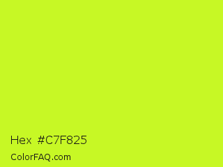 Hex #c7f825 Color is a normal lime color and the nearest color is Arctic Lime #d0ff14. Hex code #c7f825 and RGB value is rgb(199,248,37). In RGB color space, this color is composed of 78% red, 97% green, 15% blue, In CMYK color space, this color is composed of 20% cyan, 0% magenta, 85% yellow , 3% black , In HSL color space, this color has a hue angle of 74° , 94% saturation and 56% lightness.