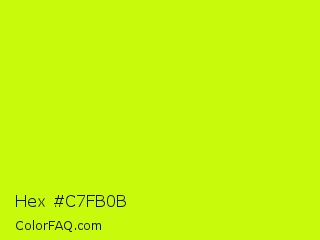 Hex #c7fb0b Color is a normal lime color and the nearest color is Electric Lime #ccff00. Hex code #c7fb0b and RGB value is rgb(199,251,11). In RGB color space, this color is composed of 78% red, 98% green, 4% blue, In CMYK color space, this color is composed of 21% cyan, 0% magenta, 96% yellow , 2% black , In HSL color space, this color has a hue angle of 73° , 97% saturation and 51% lightness.