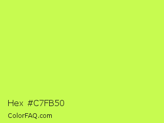 Hex #c7fb50 Color is a light lime color and the nearest color is Maximum Green Yellow #d9e650. Hex code #c7fb50 and RGB value is rgb(199,251,80). In RGB color space, this color is composed of 78% red, 98% green, 31% blue, In CMYK color space, this color is composed of 21% cyan, 0% magenta, 68% yellow , 2% black , In HSL color space, this color has a hue angle of 78° , 96% saturation and 65% lightness.