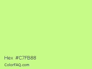 Hex #c7fb88 Color is a light green color and the nearest color is Sulu #c1f07c. Hex code #c7fb88 and RGB value is rgb(199,251,136). In RGB color space, this color is composed of 78% red, 98% green, 53% blue, In CMYK color space, this color is composed of 21% cyan, 0% magenta, 46% yellow , 2% black , In HSL color space, this color has a hue angle of 87° , 93% saturation and 76% lightness.