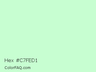 Hex #c7fed1 Color is a very light green color and the nearest color is Snowy Mint #d6ffdb. Hex code #c7fed1 and RGB value is rgb(199,254,209). In RGB color space, this color is composed of 78% red, 100% green, 82% blue, In CMYK color space, this color is composed of 22% cyan, 0% magenta, 18% yellow , 0% black , In HSL color space, this color has a hue angle of 131° , 96% saturation and 89% lightness.