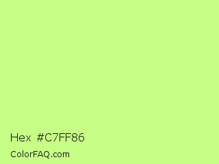 Hex #c7ff86 Color is a light green color and the nearest color is Sulu #c1f07c. Hex code #c7ff86 and RGB value is rgb(199,255,134). In RGB color space, this color is composed of 78% red, 100% green, 53% blue, In CMYK color space, this color is composed of 22% cyan, 0% magenta, 47% yellow , 0% black , In HSL color space, this color has a hue angle of 88° , 100% saturation and 76% lightness.