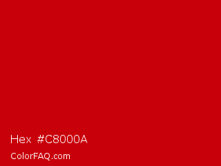 Hex #c8000a Color is a normal red color and the nearest color is Boston University Red #cc0000. Hex code #c8000a and RGB value is rgb(200,0,10). In RGB color space, this color is composed of 78% red, 0% green, 4% blue, In CMYK color space, this color is composed of 0% cyan, 100% magenta, 95% yellow , 22% black , In HSL color space, this color has a hue angle of 357° , 100% saturation and 39% lightness.