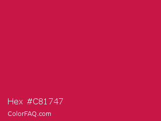 Hex #c81747 Color is a normal rose color and the nearest color is Maroon Flush #c32148. Hex code #c81747 and RGB value is rgb(200,23,71). In RGB color space, this color is composed of 78% red, 9% green, 28% blue, In CMYK color space, this color is composed of 0% cyan, 89% magenta, 65% yellow , 22% black , In HSL color space, this color has a hue angle of 344° , 79% saturation and 44% lightness.