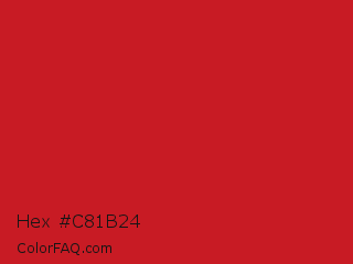 Hex #c81b24 Color is a normal red color and the nearest color is Fire Engine Red #ce2029. Hex code #c81b24 and RGB value is rgb(200,27,36). In RGB color space, this color is composed of 78% red, 11% green, 14% blue, In CMYK color space, this color is composed of 0% cyan, 87% magenta, 82% yellow , 22% black , In HSL color space, this color has a hue angle of 357° , 76% saturation and 45% lightness.