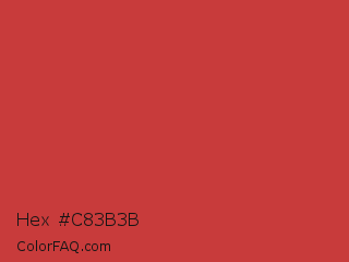 Hex #c83b3b Color is a normal red color and the nearest color is Flush Mahogany #ca3435. Hex code #c83b3b and RGB value is rgb(200,59,59). In RGB color space, this color is composed of 78% red, 23% green, 23% blue, In CMYK color space, this color is composed of 0% cyan, 71% magenta, 71% yellow , 22% black , In HSL color space, this color has a hue angle of 0° , 56% saturation and 51% lightness.