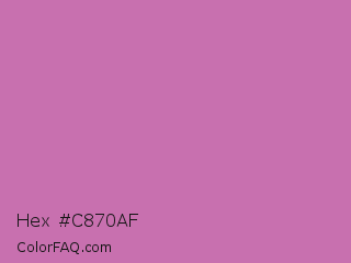 Hex #c870af Color is a light magenta color and the nearest color is Sky Magenta #cf71af. Hex code #c870af and RGB value is rgb(200,112,175). In RGB color space, this color is composed of 78% red, 44% green, 69% blue, In CMYK color space, this color is composed of 0% cyan, 44% magenta, 13% yellow , 22% black , In HSL color space, this color has a hue angle of 317° , 44% saturation and 61% lightness.