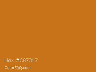 Hex #c87317 Color is a normal orange color and the nearest color is Ochre #cc7722. Hex code #c87317 and RGB value is rgb(200,115,23). In RGB color space, this color is composed of 78% red, 45% green, 9% blue, In CMYK color space, this color is composed of 0% cyan, 43% magenta, 89% yellow , 22% black , In HSL color space, this color has a hue angle of 31° , 79% saturation and 44% lightness.