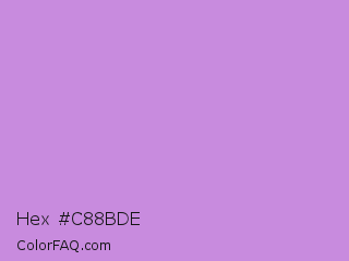 Hex #c88bde Color is a light purple color and the nearest color is Bright Lavender #bf94e4. Hex code #c88bde and RGB value is rgb(200,139,222). In RGB color space, this color is composed of 78% red, 55% green, 87% blue, In CMYK color space, this color is composed of 10% cyan, 37% magenta, 0% yellow , 13% black , In HSL color space, this color has a hue angle of 284° , 56% saturation and 71% lightness.