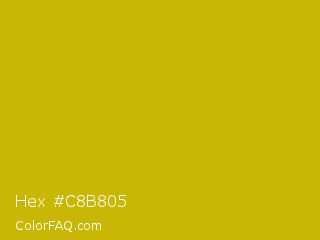 Hex #c8b805 Color is a normal yellow color and the nearest color is Galliano #dcb20c. Hex code #c8b805 and RGB value is rgb(200,184,5). In RGB color space, this color is composed of 78% red, 72% green, 2% blue, In CMYK color space, this color is composed of 0% cyan, 8% magenta, 98% yellow , 22% black , In HSL color space, this color has a hue angle of 55° , 95% saturation and 40% lightness.