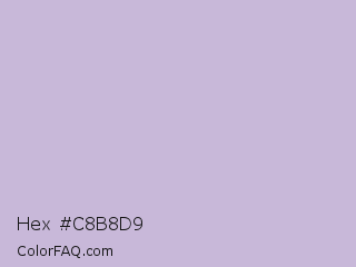 Hex #c8b8d9 Color is a light violet color and the nearest color is Blue Haze #bfbed8. Hex code #c8b8d9 and RGB value is rgb(200,184,217). In RGB color space, this color is composed of 78% red, 72% green, 85% blue, In CMYK color space, this color is composed of 8% cyan, 15% magenta, 0% yellow , 15% black , In HSL color space, this color has a hue angle of 269° , 30% saturation and 79% lightness.