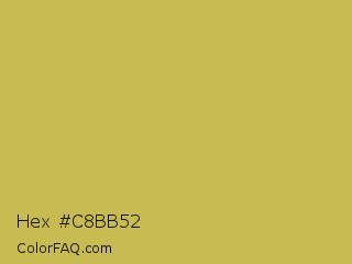 Hex #c8bb52 Color is a normal yellow color and the nearest color is Turmeric #cabb48. Hex code #c8bb52 and RGB value is rgb(200,187,82). In RGB color space, this color is composed of 78% red, 73% green, 32% blue, In CMYK color space, this color is composed of 0% cyan, 7% magenta, 59% yellow , 22% black , In HSL color space, this color has a hue angle of 53° , 52% saturation and 55% lightness.