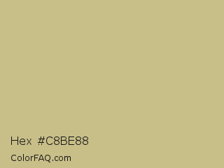 Hex #c8be88 Color is a light yellow color and the nearest color is Sorrell Brown #ceb98f. Hex code #c8be88 and RGB value is rgb(200,190,136). In RGB color space, this color is composed of 78% red, 75% green, 53% blue, In CMYK color space, this color is composed of 0% cyan, 5% magenta, 32% yellow , 22% black , In HSL color space, this color has a hue angle of 51° , 37% saturation and 66% lightness.