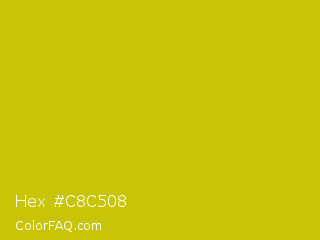 Hex #c8c508 Color is a normal yellow color and the nearest color is Rio Grande #bbd009. Hex code #c8c508 and RGB value is rgb(200,197,8). In RGB color space, this color is composed of 78% red, 77% green, 3% blue, In CMYK color space, this color is composed of 0% cyan, 2% magenta, 96% yellow , 22% black , In HSL color space, this color has a hue angle of 59° , 92% saturation and 41% lightness.