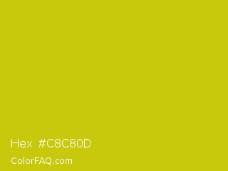 Hex #c8c80d Color is a normal yellow color and the nearest color is Rio Grande #bbd009. Hex code #c8c80d and RGB value is rgb(200,200,13). In RGB color space, this color is composed of 78% red, 78% green, 5% blue, In CMYK color space, this color is composed of 0% cyan, 0% magenta, 94% yellow , 22% black , In HSL color space, this color has a hue angle of 60° , 88% saturation and 42% lightness.
