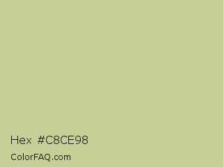 Hex #c8ce98 Color is a light yellow color and the nearest color is Pine Glade #c7cd90. Hex code #c8ce98 and RGB value is rgb(200,206,152). In RGB color space, this color is composed of 78% red, 81% green, 60% blue, In CMYK color space, this color is composed of 3% cyan, 0% magenta, 26% yellow , 19% black , In HSL color space, this color has a hue angle of 67° , 36% saturation and 70% lightness.