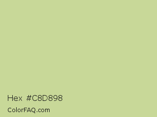 Hex #c8d898 Color is a light lime color and the nearest color is Deco #d2da97. Hex code #c8d898 and RGB value is rgb(200,216,152). In RGB color space, this color is composed of 78% red, 85% green, 60% blue, In CMYK color space, this color is composed of 7% cyan, 0% magenta, 30% yellow , 15% black , In HSL color space, this color has a hue angle of 75° , 45% saturation and 72% lightness.