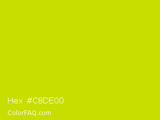 Hex #c8de00 Color is a normal yellow color and the nearest color is Bitter Lemon #cae00d. Hex code #c8de00 and RGB value is rgb(200,222,0). In RGB color space, this color is composed of 78% red, 87% green, 0% blue, In CMYK color space, this color is composed of 10% cyan, 0% magenta, 100% yellow , 13% black , In HSL color space, this color has a hue angle of 66° , 100% saturation and 44% lightness.