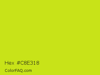 Hex #c8e318 Color is a normal yellow color and the nearest color is Las Palmas #c6e610. Hex code #c8e318 and RGB value is rgb(200,227,24). In RGB color space, this color is composed of 78% red, 89% green, 9% blue, In CMYK color space, this color is composed of 12% cyan, 0% magenta, 89% yellow , 11% black , In HSL color space, this color has a hue angle of 68° , 81% saturation and 49% lightness.