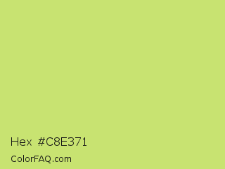 Hex #c8e371 Color is a light lime color and the nearest color is Yellow Green #c5e17a. Hex code #c8e371 and RGB value is rgb(200,227,113). In RGB color space, this color is composed of 78% red, 89% green, 44% blue, In CMYK color space, this color is composed of 12% cyan, 0% magenta, 50% yellow , 11% black , In HSL color space, this color has a hue angle of 74° , 67% saturation and 67% lightness.