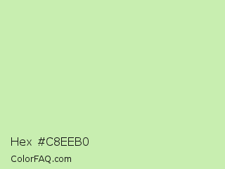 Hex #c8eeb0 Color is a very light green color and the nearest color is Gossip #d2f8b0. Hex code #c8eeb0 and RGB value is rgb(200,238,176). In RGB color space, this color is composed of 78% red, 93% green, 69% blue, In CMYK color space, this color is composed of 16% cyan, 0% magenta, 26% yellow , 7% black , In HSL color space, this color has a hue angle of 97° , 65% saturation and 81% lightness.