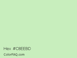 Hex #c8eebd Color is a very light green color and the nearest color is Tea Green #d0f0c0. Hex code #c8eebd and RGB value is rgb(200,238,189). In RGB color space, this color is composed of 78% red, 93% green, 74% blue, In CMYK color space, this color is composed of 16% cyan, 0% magenta, 21% yellow , 7% black , In HSL color space, this color has a hue angle of 107° , 59% saturation and 84% lightness.