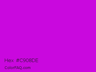 Hex #c908de Color is a normal magenta color and the nearest color is Vivid Mulberry #b80ce3. Hex code #c908de and RGB value is rgb(201,8,222). In RGB color space, this color is composed of 79% red, 3% green, 87% blue, In CMYK color space, this color is composed of 9% cyan, 96% magenta, 0% yellow , 13% black , In HSL color space, this color has a hue angle of 294° , 93% saturation and 45% lightness.