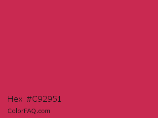 Hex #c92951 Color is a normal red color and the nearest color is Dingy Dungeon #c53151. Hex code #c92951 and RGB value is rgb(201,41,81). In RGB color space, this color is composed of 79% red, 16% green, 32% blue, In CMYK color space, this color is composed of 0% cyan, 80% magenta, 60% yellow , 21% black , In HSL color space, this color has a hue angle of 345° , 66% saturation and 47% lightness.