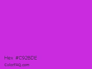 Hex #c92bde Color is a normal magenta color and the nearest color is Steel Pink #cc33cc. Hex code #c92bde and RGB value is rgb(201,43,222). In RGB color space, this color is composed of 79% red, 17% green, 87% blue, In CMYK color space, this color is composed of 9% cyan, 81% magenta, 0% yellow , 13% black , In HSL color space, this color has a hue angle of 293° , 73% saturation and 52% lightness.