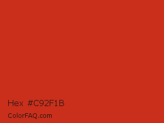 Hex #c92f1b Color is a normal red color and the nearest color is Thunderbird #c02b18. Hex code #c92f1b and RGB value is rgb(201,47,27). In RGB color space, this color is composed of 79% red, 18% green, 11% blue, In CMYK color space, this color is composed of 0% cyan, 77% magenta, 87% yellow , 21% black , In HSL color space, this color has a hue angle of 7° , 76% saturation and 45% lightness.