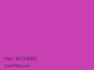 Hex #c940b2 Color is a normal magenta color and the nearest color is Byzantine #bd33a4. Hex code #c940b2 and RGB value is rgb(201,64,178). In RGB color space, this color is composed of 79% red, 25% green, 70% blue, In CMYK color space, this color is composed of 0% cyan, 68% magenta, 11% yellow , 21% black , In HSL color space, this color has a hue angle of 310° , 56% saturation and 52% lightness.