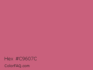 Hex #c9607c Color is a normal rose color and the nearest color is Cinnamon Satin #cd607e. Hex code #c9607c and RGB value is rgb(201,96,124). In RGB color space, this color is composed of 79% red, 38% green, 49% blue, In CMYK color space, this color is composed of 0% cyan, 52% magenta, 38% yellow , 21% black , In HSL color space, this color has a hue angle of 344° , 49% saturation and 58% lightness.