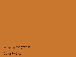 Hex #c9772f Color is a normal orange color and the nearest color is Bronze #cd7f32. Hex code #c9772f and RGB value is rgb(201,119,47). In RGB color space, this color is composed of 79% red, 47% green, 18% blue, In CMYK color space, this color is composed of 0% cyan, 41% magenta, 77% yellow , 21% black , In HSL color space, this color has a hue angle of 28° , 62% saturation and 49% lightness.