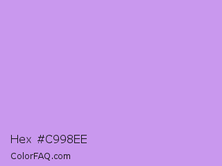 Hex #c998ee Color is a light purple color and the nearest color is Bright Ube #d19fe8. Hex code #c998ee and RGB value is rgb(201,152,238). In RGB color space, this color is composed of 79% red, 60% green, 93% blue, In CMYK color space, this color is composed of 16% cyan, 36% magenta, 0% yellow , 7% black , In HSL color space, this color has a hue angle of 274° , 72% saturation and 76% lightness.