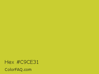 Hex #c9ce31 Color is a normal yellow color and the nearest color is Key Lime Pie #bfc921. Hex code #c9ce31 and RGB value is rgb(201,206,49). In RGB color space, this color is composed of 79% red, 81% green, 19% blue, In CMYK color space, this color is composed of 2% cyan, 0% magenta, 76% yellow , 19% black , In HSL color space, this color has a hue angle of 62° , 62% saturation and 50% lightness.
