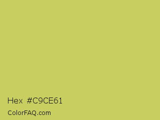 Hex #c9ce61 Color is a normal yellow color and the nearest color is Tacha #d6c562. Hex code #c9ce61 and RGB value is rgb(201,206,97). In RGB color space, this color is composed of 79% red, 81% green, 38% blue, In CMYK color space, this color is composed of 2% cyan, 0% magenta, 53% yellow , 19% black , In HSL color space, this color has a hue angle of 63° , 53% saturation and 59% lightness.