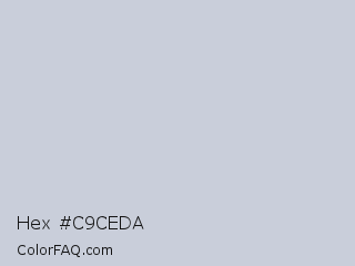 Hex #c9ceda Color is a very light blue color and the nearest color is Ghost #c7c9d5. Hex code #c9ceda and RGB value is rgb(201,206,218). In RGB color space, this color is composed of 79% red, 81% green, 85% blue, In CMYK color space, this color is composed of 8% cyan, 6% magenta, 0% yellow , 15% black , In HSL color space, this color has a hue angle of 222° , 19% saturation and 82% lightness.