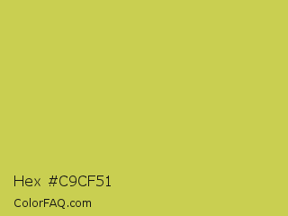 Hex #c9cf51 Color is a normal yellow color and the nearest color is June Bud #bdda57. Hex code #c9cf51 and RGB value is rgb(201,207,81). In RGB color space, this color is composed of 79% red, 81% green, 32% blue, In CMYK color space, this color is composed of 3% cyan, 0% magenta, 61% yellow , 19% black , In HSL color space, this color has a hue angle of 63° , 57% saturation and 56% lightness.