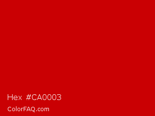 Hex #ca0003 Color is a normal red color and the nearest color is Boston University Red #cc0000. Hex code #ca0003 and RGB value is rgb(202,0,3). In RGB color space, this color is composed of 79% red, 0% green, 1% blue, In CMYK color space, this color is composed of 0% cyan, 100% magenta, 99% yellow , 21% black , In HSL color space, this color has a hue angle of 359° , 100% saturation and 40% lightness.