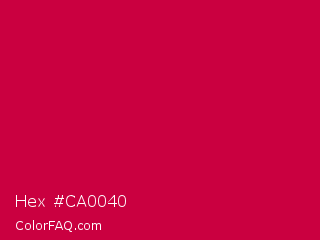 Hex #ca0040 Color is a normal rose color and the nearest color is Utah Crimson #d3003f. Hex code #ca0040 and RGB value is rgb(202,0,64). In RGB color space, this color is composed of 79% red, 0% green, 25% blue, In CMYK color space, this color is composed of 0% cyan, 100% magenta, 68% yellow , 21% black , In HSL color space, this color has a hue angle of 341° , 100% saturation and 40% lightness.