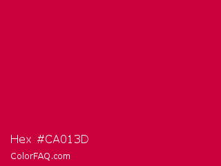 Hex #ca013d Color is a normal rose color and the nearest color is Utah Crimson #d3003f. Hex code #ca013d and RGB value is rgb(202,1,61). In RGB color space, this color is composed of 79% red, 0% green, 24% blue, In CMYK color space, this color is composed of 0% cyan, 100% magenta, 70% yellow , 21% black , In HSL color space, this color has a hue angle of 342° , 99% saturation and 40% lightness.