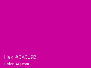 Hex #ca019b Color is a normal magenta color and the nearest color is Red Violet #c71585. Hex code #ca019b and RGB value is rgb(202,1,155). In RGB color space, this color is composed of 79% red, 0% green, 61% blue, In CMYK color space, this color is composed of 0% cyan, 100% magenta, 23% yellow , 21% black , In HSL color space, this color has a hue angle of 314° , 99% saturation and 40% lightness.
