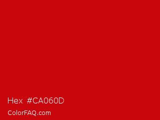 Hex #ca060d Color is a normal red color and the nearest color is Venetian Red #c80815. Hex code #ca060d and RGB value is rgb(202,6,13). In RGB color space, this color is composed of 79% red, 2% green, 5% blue, In CMYK color space, this color is composed of 0% cyan, 97% magenta, 94% yellow , 21% black , In HSL color space, this color has a hue angle of 358° , 94% saturation and 41% lightness.