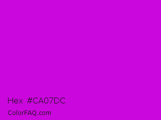 Hex #ca07dc Color is a normal magenta color and the nearest color is Deep Magenta #cc00cc. Hex code #ca07dc and RGB value is rgb(202,7,220). In RGB color space, this color is composed of 79% red, 3% green, 86% blue, In CMYK color space, this color is composed of 8% cyan, 97% magenta, 0% yellow , 14% black , In HSL color space, this color has a hue angle of 295° , 94% saturation and 45% lightness.