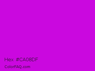 Hex #ca08df Color is a normal magenta color and the nearest color is Vivid Mulberry #b80ce3. Hex code #ca08df and RGB value is rgb(202,8,223). In RGB color space, this color is composed of 79% red, 3% green, 87% blue, In CMYK color space, this color is composed of 9% cyan, 96% magenta, 0% yellow , 13% black , In HSL color space, this color has a hue angle of 294° , 93% saturation and 45% lightness.